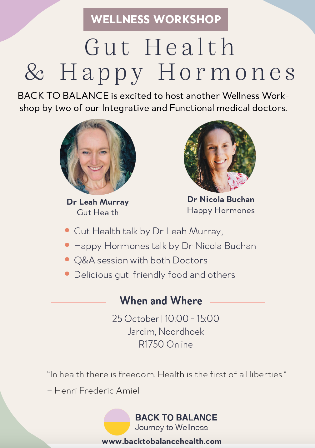 At Back to Balance, we believe that true wellness begins with understanding the rhythms of your own body. That’s why we’re excited to invite you to our upcoming Wellness Workshop: Gut Health & Happy Hormones, hosted by our integrative and functional medicine doctors, Dr Leah Murray and Dr Nicola Buchan.